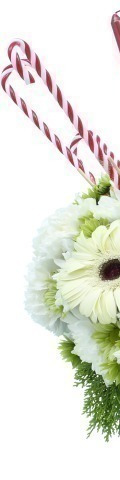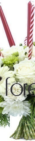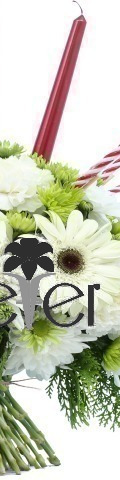 5 White Roses, 2 White Gerbera, 5 White Carnations, Green Chrysanthemums, 5 Candy Canes, 3 Red Candles