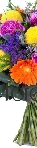 Bold, bright, and bursting with natural beauty, the Summer Celebration is an exceptional floral arrangement for life's special occasions. With 3 zesty orange gerberas, 6 flamboyant purple carnations, 4 sunburst yellow pompoms, electric blue statice, and a selection of seasonal greenery, it is a celebration of summer colours.